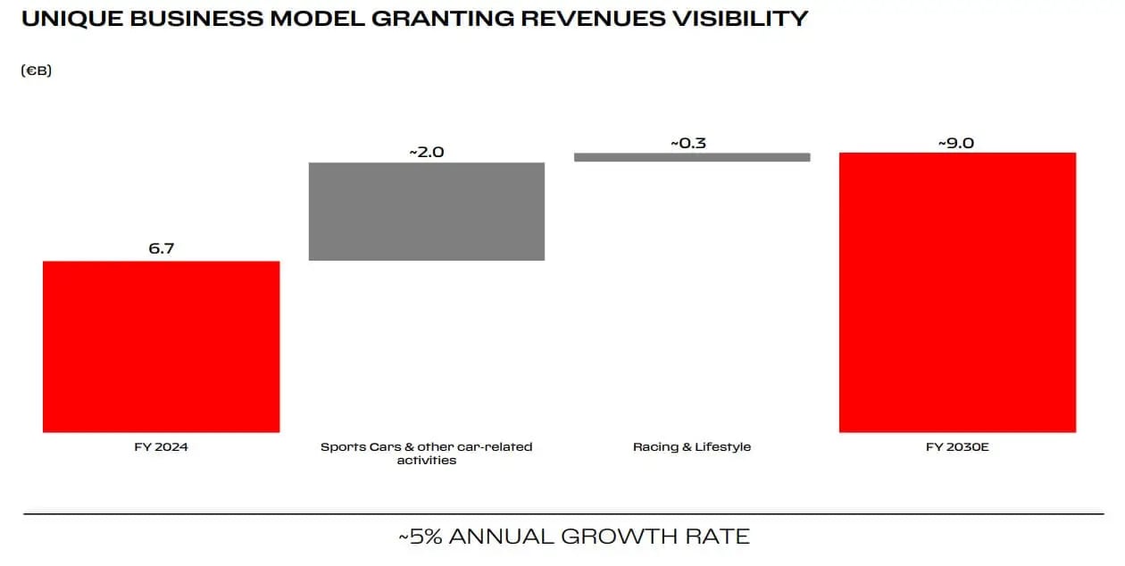 O guidance também decepcionou. A Ferrari projetou que, até 2030, as receitas vão crescer de €6,7 bilhões em 2024 para €9 bilhões. Isso corresponde a um crescimento médio anual de +5%. O consenso esperava algo mais próximo de €10 bilhões. Ou seja, o mercado esperava um crescimento médio anual de +7% enquanto a empresa diz que será de apenas +5%.