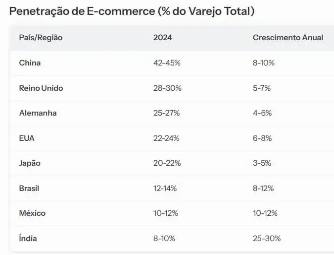 Embora estejamos em franco crescimento, ainda falta muito para nos igualarmos a países mais desenvolvidos. A penetração do e-commerce como percentual do varejo total ainda é baixa, quando comparada à de países como China, EUA, Alemanha, Reino Unido ou Japão.