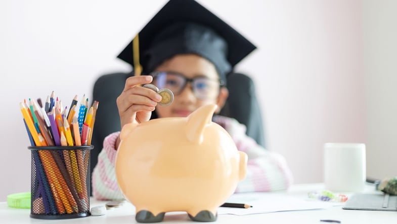 Cofre em formatod e porquinho sob superfície de madeira ao lado de cédulas, moeda, diploma e chapéu de formatura