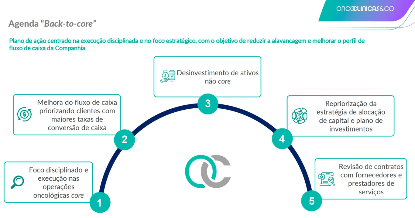 Apesar de ser líder no segmento no Brasil, com quase 30% das clínicas privadas de oncologia do país, a empresa vem enfrentando grandes desafios operacionais e financeiros recentemente, principalmente por conta da baixa conversão de caixa operacional, das pressões adicionais de suas operações não core, do alto capex de expansão e de sua elevada alavancagem financeira (ainda em 3x Dívida líquida/Ebitda, mesmo após o aumento de capital recente).