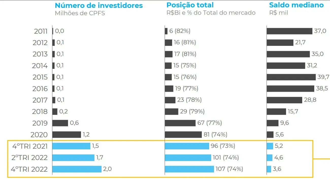 Foi em 2012 que atingimos os primeiros 100 mil investidores nessa classe de ativos. De 2016 a 2019, o crescimento foi acelerado, mas, mesmo depois da pandemia, em 2020, o número não parou de crescer.