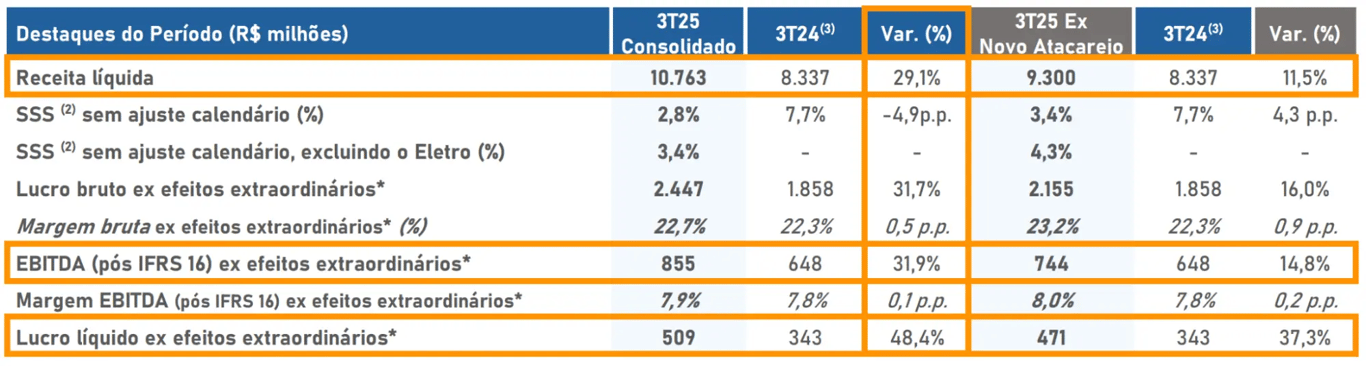 Impulsionada pela transação, a receita líquida totalizou R$ 10,8 bilhões, alta de +29% (sem o Novo Atacarejo, a receita teria ficado em R$ 9,3 bilhões, alta de +12%).