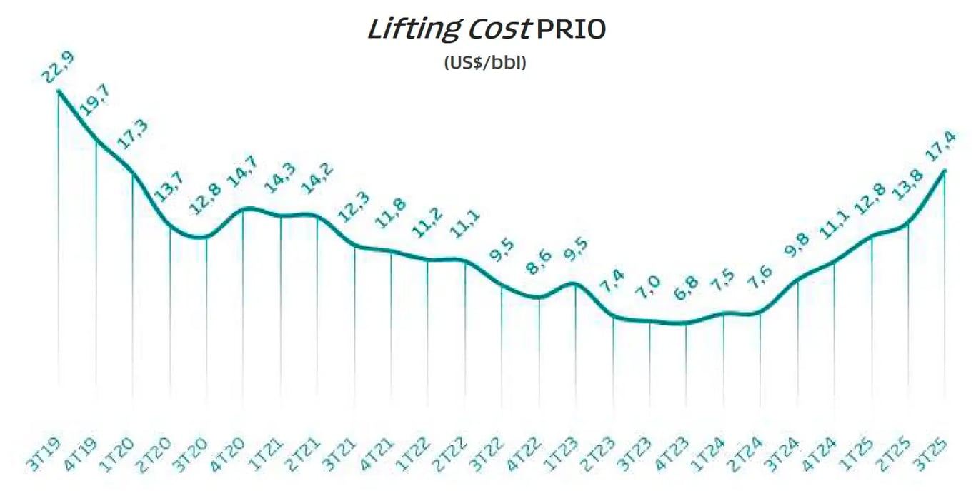 Além do forte crescimento na produção, os campos de Wahoo e Peregrino também contribuirão fortemente para a redução do lifting cost (custo de extração) da PRIO, que está em alta desde o começo de 2024 e superou os US$ 17 no 3T25, mas tende a cair para apenas um dígito já no segundo semestre de 2026.