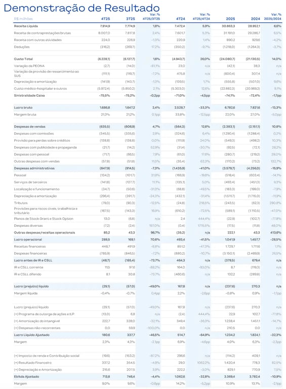 A Hapvida (HAPV3) reportou resultados ainda mais negativos no 4T25, com receita líquida de R$ 7,9 bilhões, crescimento de +6%, enquanto o Ebitda foi de R$ 714 milhões, queda de -33%, e o lucro líquido foi de R$ 181 milhões, recuo de -65%. Todos os resultados foram comparados com o mesmo período do ano anterior.