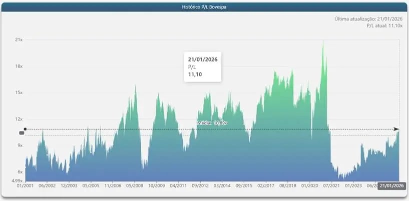 O resultado é que hoje estamos em um ponto diferente do ciclo. O Ibovespa voltou a negociar perto do seu múltiplo médio histórico, em torno de 11x lucro. Isso não significa bolha, mas significa normalização.