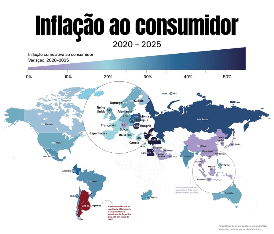 Com base em dados do Deutsche Bank, compilados pela Visual Capitalist, o cenário inflacionário do período escancara contrastes intensos provocados por pandemias, guerras, choques de oferta, políticas monetárias estimulativas e decisões fiscais expansionistas.