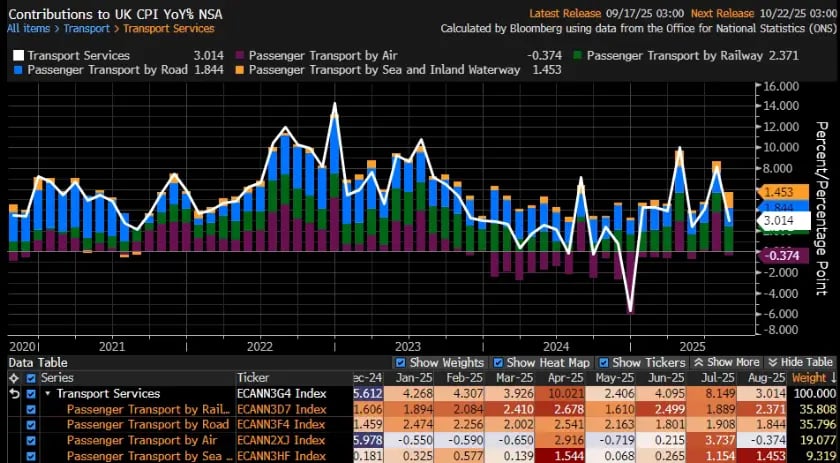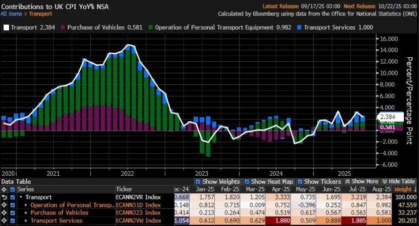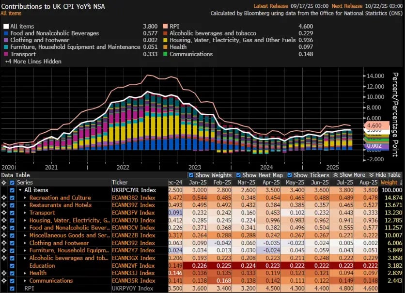 A inflação do Reino Unido, medida pelo CPI, mostra um persistente distanciamento dos preços à sua meta (2%), desde outubro de 2024. O resultado de agosto, repetindo o dado de julho, mostra o índice de preços anual em 3,8% — em linha com o projetado pelo mercado.