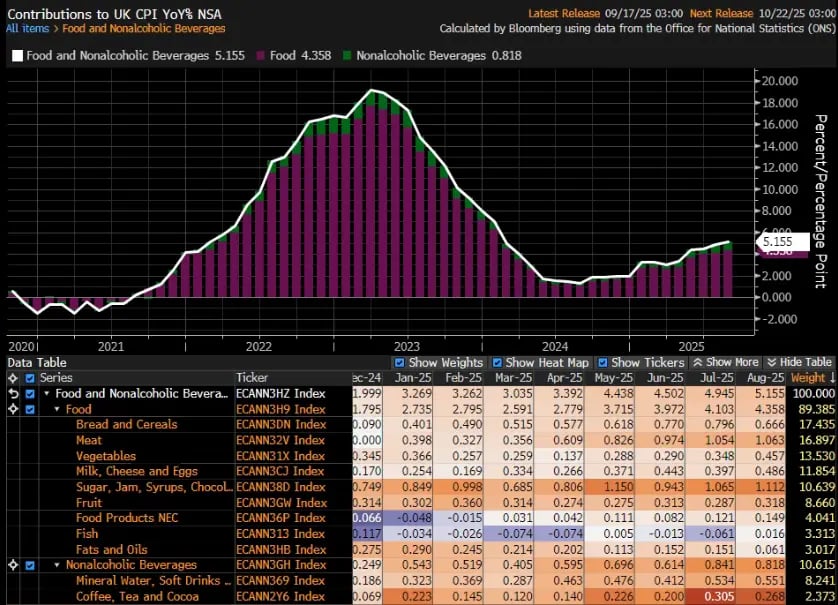 Os dados indicam que a inflação no Reino Unido permanece acima da meta e em patamar elevado, com pressões notáveis nos preços dos alimentos e da habitação.
