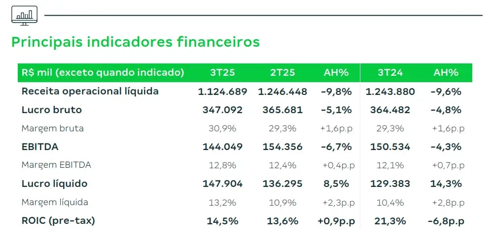 Já o lucro líquido teve crescimento sustentado por aumento na receita financeira, queda nas despesas financeiras e menor impacto de variação cambial, além de melhora na apuração de tributos.