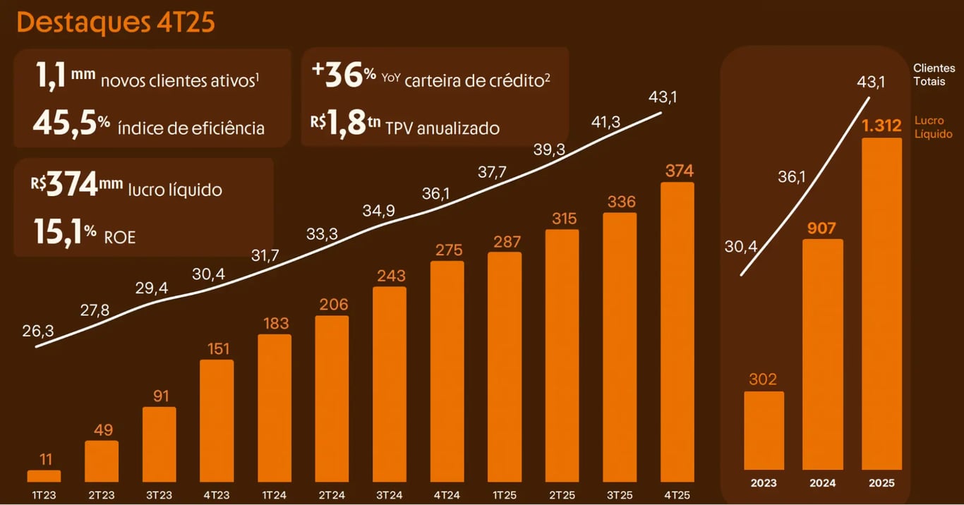 Entre os resultados do quarto trimestre de 2025 do banco, vale destacar o crescimento de +29% em transações via Pix e cartões, que alcançaram R$ 462 bilhões (8,5% de share nas transações via Pix e 2,6% no TPV de cartões).