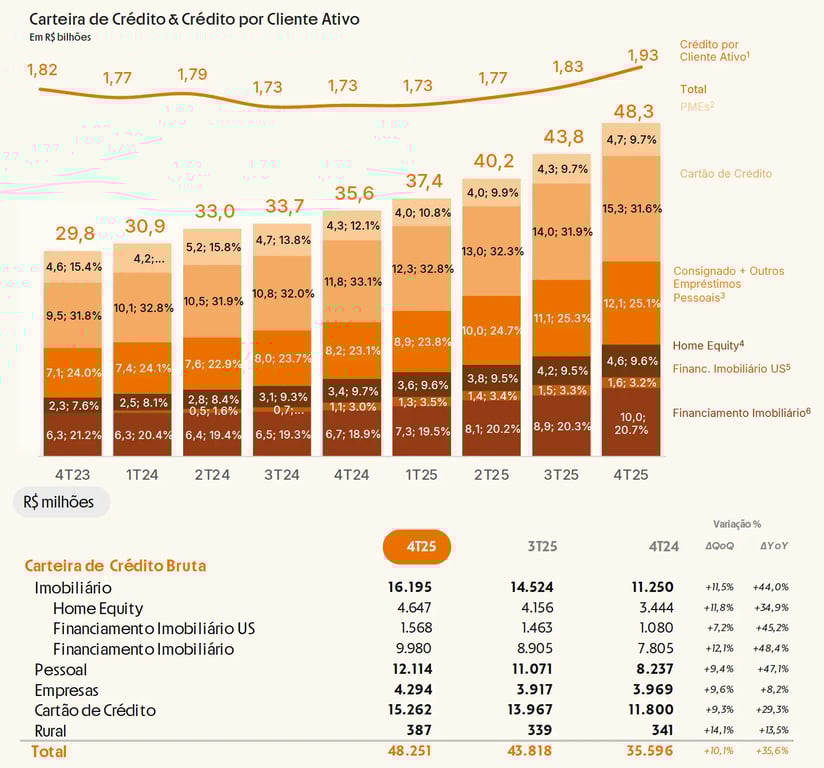 A carteira de crédito do Inter alcançou R$ 48,3 bilhões, acelerando o crescimento para +36% (3,6x maior do que o do mercado no período), com destaque para o consignado privado, que atingiu R$ 1,9 bilhão; o financiamento imobiliário, que chegou a R$ 10 bilhões (+48%); e a carteira de cartão de crédito, que avançou +29%, com melhoria na rentabilidade.