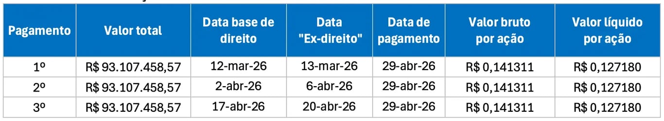O pagamento será realizado no dia 29 de abril deste ano, mas terá três datas-com (limite para comprar a ação e receber o dividendo) diferentes, conforme indicado na tabela abaixo.