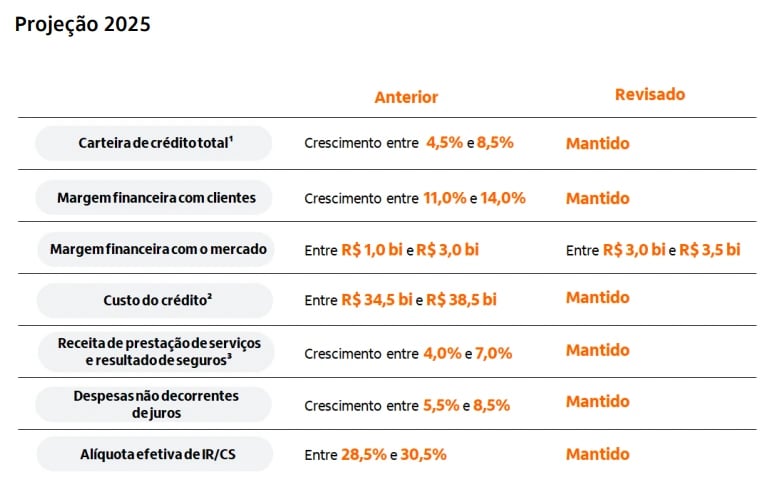 Ainda que algumas projeções para 2025 sejam inferiores às apresentadas no ano anterior, o Itaú segue confiante em seu crescimento. Em relação às suas principais linhas, manteve as expectativas de expansão da carteira de crédito, da margem financeira com clientes e das receitas com prestação de serviços e seguros.