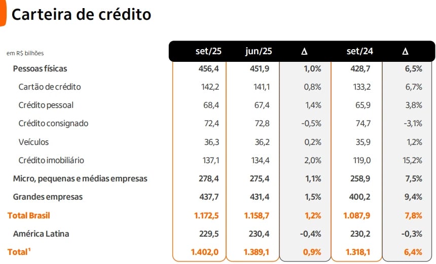A carteira de crédito total do Itaú atingiu R$ 1,4 trilhão no 3T25, alta de +6,4% (vs. 3T24). No Brasil, a carteira de pessoas físicas subiu +6,5%, com destaques para crédito imobiliário (+15,2%) e cartão de crédito (+6,7%). Ainda ocorreram aumentos relevantes na carteira de micro, pequenas e médias empresas, com alta de +7,5%, e na carteira de grandes empresas, que subiu +9,4%.