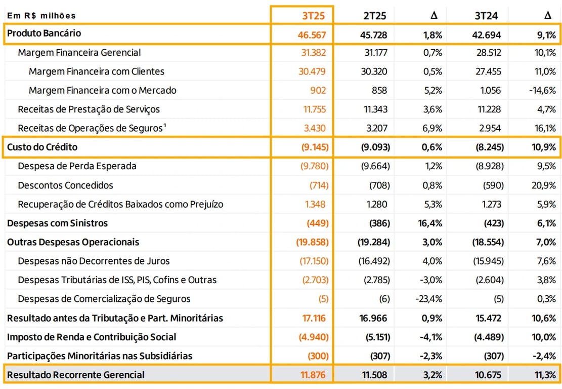 As receitas de prestação de serviços atingiram R$ 11,8 bilhões, subindo +4,7%. Já a receita de seguros foi de R$ 3,4 bilhões (+16,1%). Assim, o produto bancário (margem financeira + receitas de serviços e seguros) totalizou R$ 46,6 bilhões (+9,1%).