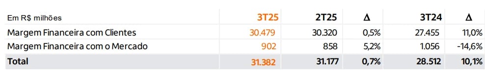 O banco entregou uma margem financeira (clientes + mercado) de R$ 31,4 bilhões, alta de +10,1% na comparação anual. A margem financeira com clientes subiu +11%, em função, principalmente, de maiores volumes de crédito, maiores margens de passivos e com capital de giro próprio. Já a margem financeira com o mercado (menos representativa) caiu -14,6%.