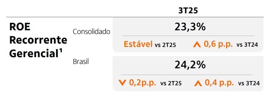 O Itaú (ITUB3) reportou resultados em linha com o consenso do mercado no 3T25, com um lucro líquido de R$ 11,9 bilhões, alta de +11,3%, e um ROE (retorno sobre patrimônio líquido) mantendo a marca de 23,3% (+0,6 p.p.).