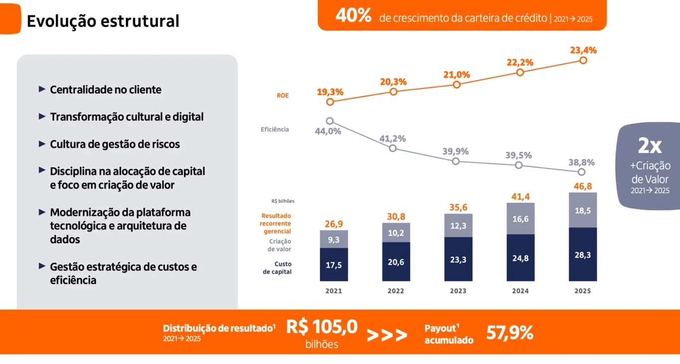 O banco ainda se destaca como um dos maiores pagadores de dividendos do setor no país, tendo distribuído, entre 2021 e 2025, R$ 105 bilhões em proventos (um payout de quase 60%).