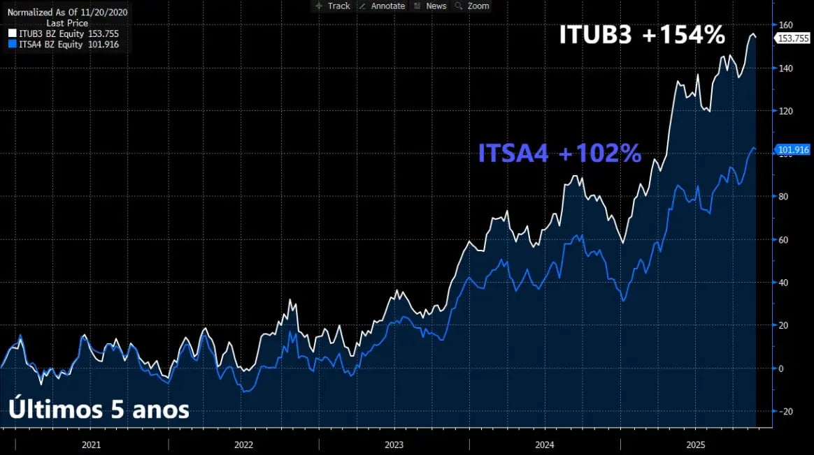 Inclusive, nos últimos cinco anos, vimos as ações do banco (+154%) apresentarem uma performance bem superior em relação à dos papéis da holding (+102%), considerando o retorno das ações mais os proventos.