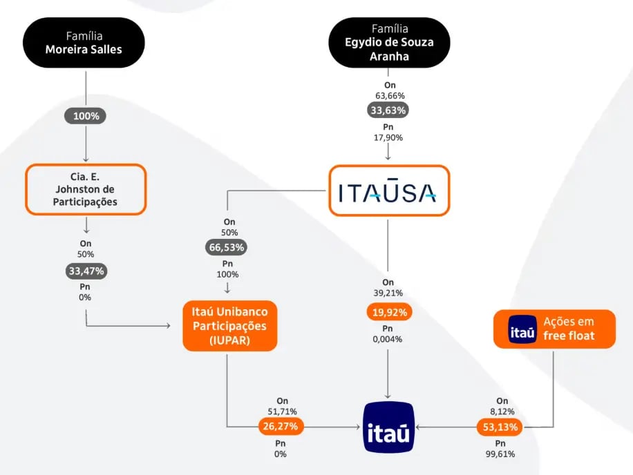 A Itaúsa detém 37,7% do Itaú, mas apenas 19,9% é detida de forma direta. O restante da participação é via Iupar, holding controladora do Itaú, com mais de 50% das ações ordinárias, na qual a família Moreira Salles se expõe ao banco.