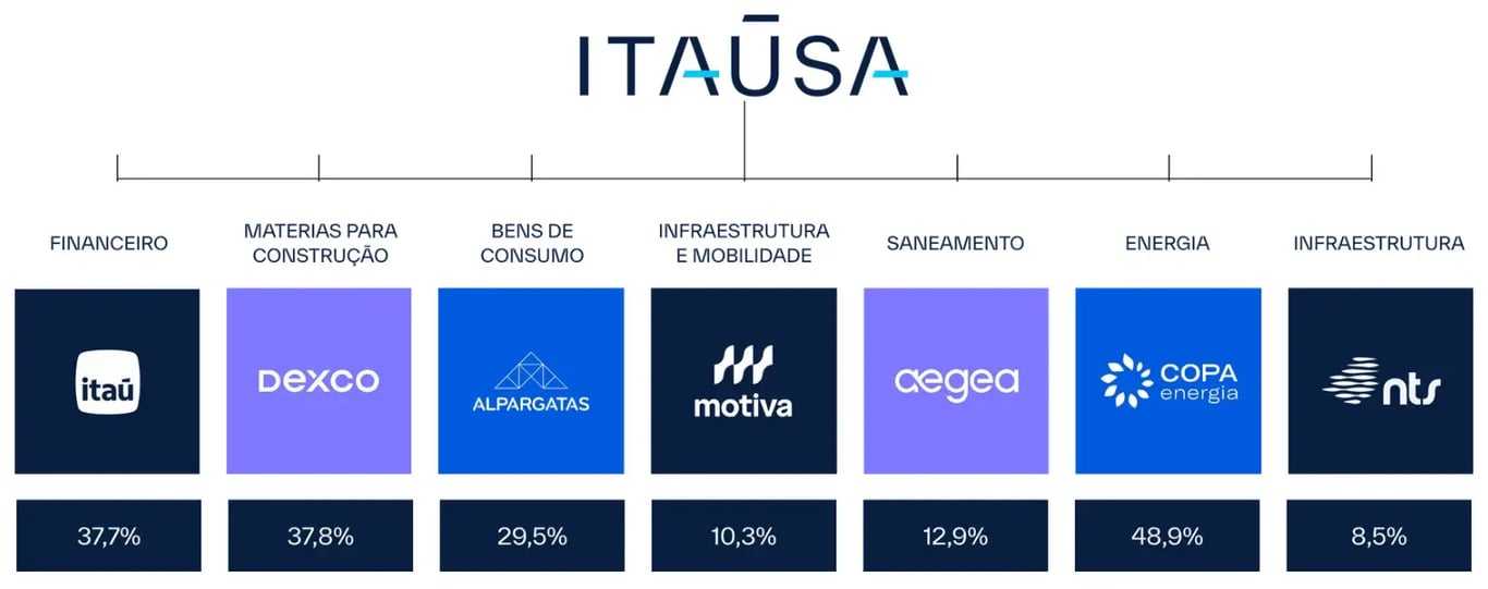 A Itaúsa é uma holding de investimentos controlada pela família Egydio de Souza Aranha. Em outras palavras, não é um negócio operacional, mas sim uma companhia que detém participações em outras empresas, como mostra a imagem abaixo, que indica o peso da holding em cada investida.