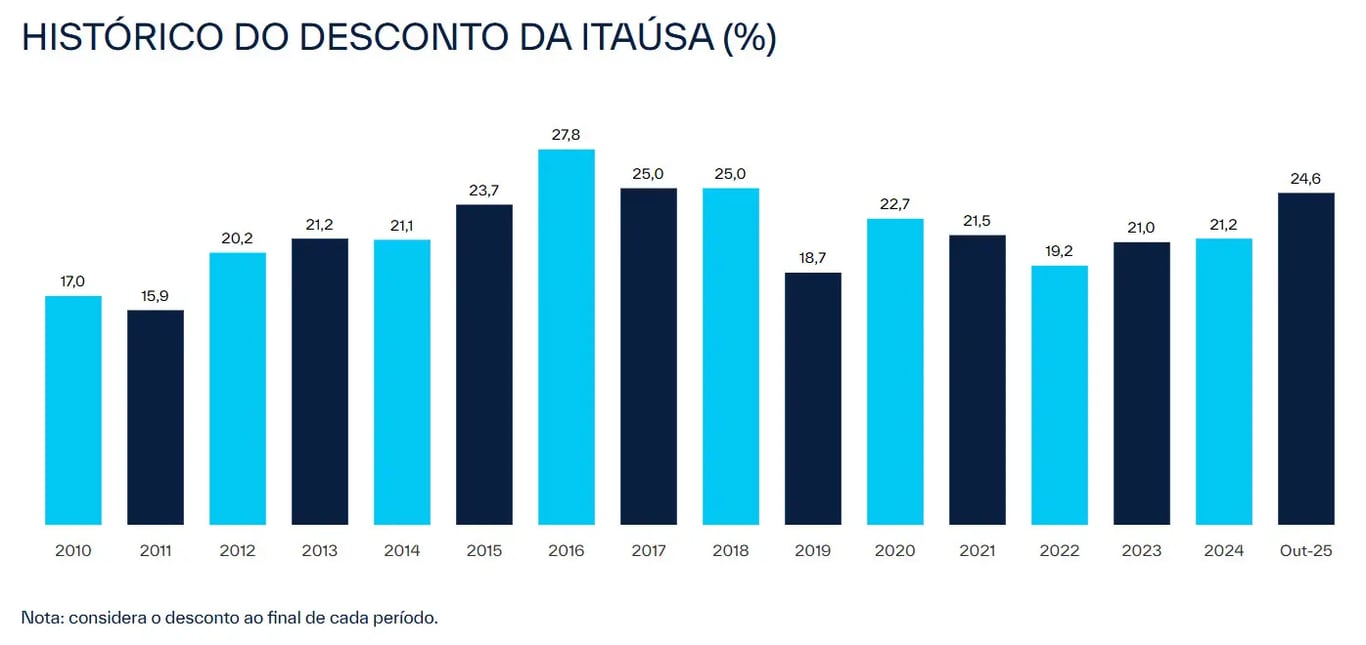 Como consequência, o mercado incorpora esses custos e riscos no preço da holding. Hoje, a Itaúsa negocia com um desconto próximo de 25% em relação ao valor de mercado de suas investidas, acima da média histórica de cerca de 22%.