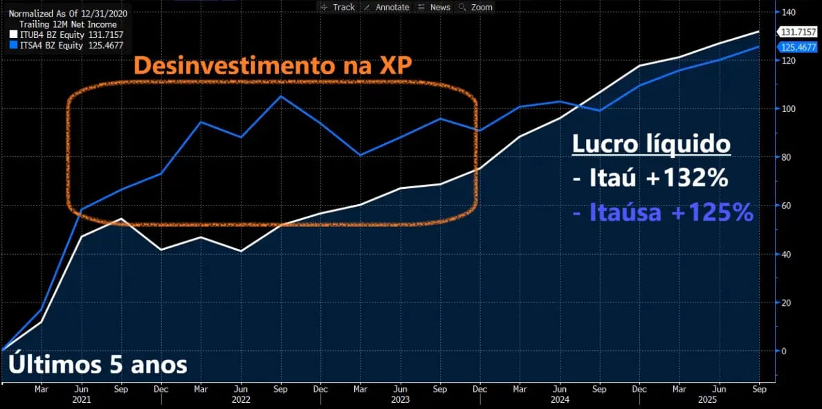 Entre 2021 e 2023, o lucro da Itaúsa recebeu um reforço relevante com a venda gradual da participação na XP. Ainda assim, no acumulado dos últimos cinco anos, o lucro do Itaú cresceu +132%, enquanto o da holding avançou +125%.