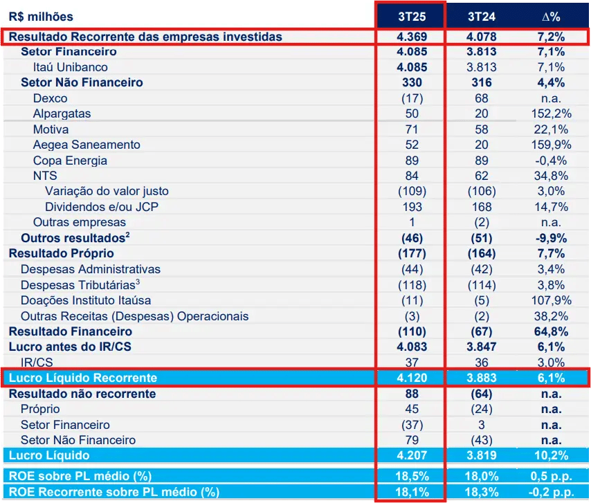 Com as despesas referentes às próprias operações da Itaúsa crescendo +8% e um resultado financeiro (negativo) subindo +65%, o lucro líquido recorrente atingiu R$ 4,1 bilhões no 3T25, um aumento de +6%. Já o ROE alcançou 18,1% (-0,2 p.p.).