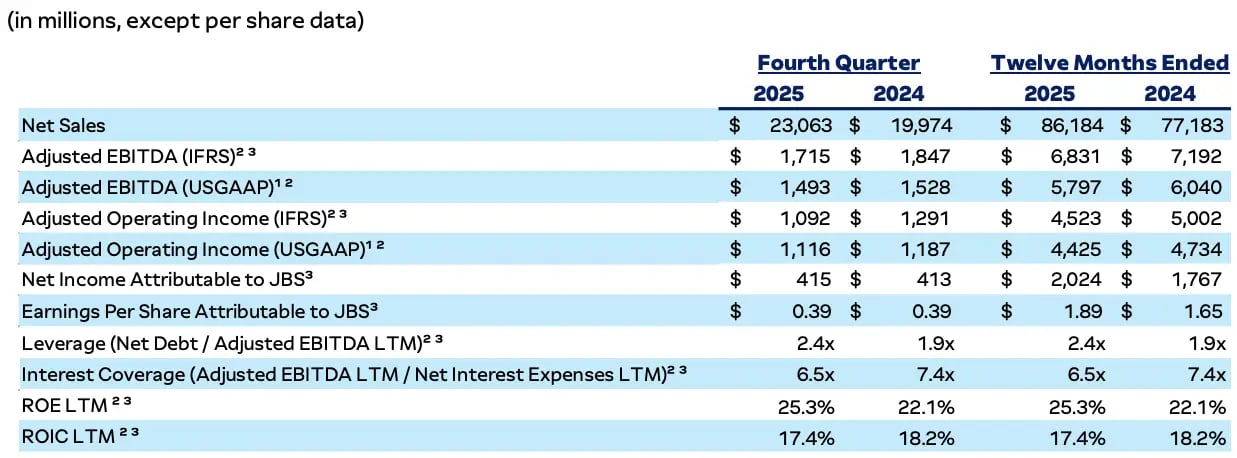 A JBS (JBSS32) registrou uma receita líquida de US$ 23,06 bilhões no 4T25, alta de +15% na comparação anual. Já o Ebitda foi de US$ 1,72 bilhão (-7%), enquanto o lucro líquido totalizou US$ 415 milhões, praticamente estável em relação ao 4T24.