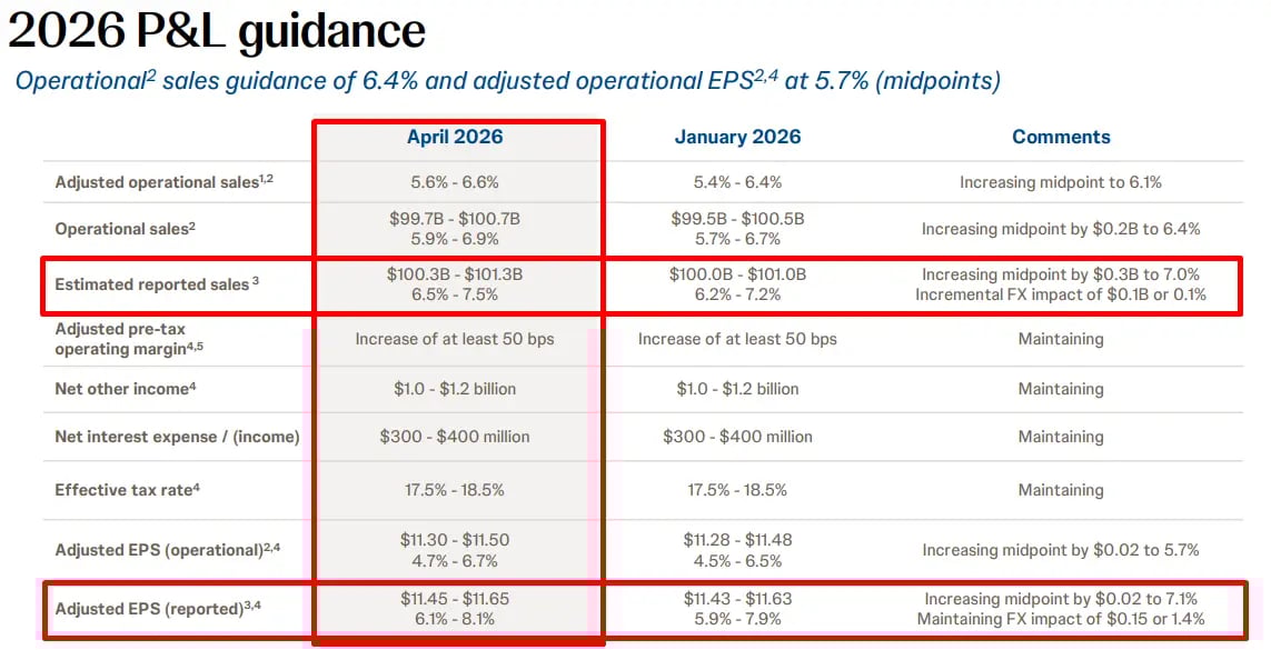 A JNJ elevou sua projeção para 2026, passando a esperar receitas entre US$ 100,3 bilhões e US$ 101,3 bilhões, com ponto médio de US$ 100,8 bilhões, e EPS ajustado entre US$ 11,45 e US$ 11,65, com ponto médio de US$ 11,55.