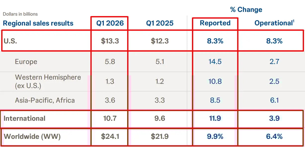 Ao analisar as receitas por geografia, os Estados Unidos seguem como a principal parcela do faturamento. O crescimento no país foi de +8,3%, alcançando US$ 13,3 bilhões.
