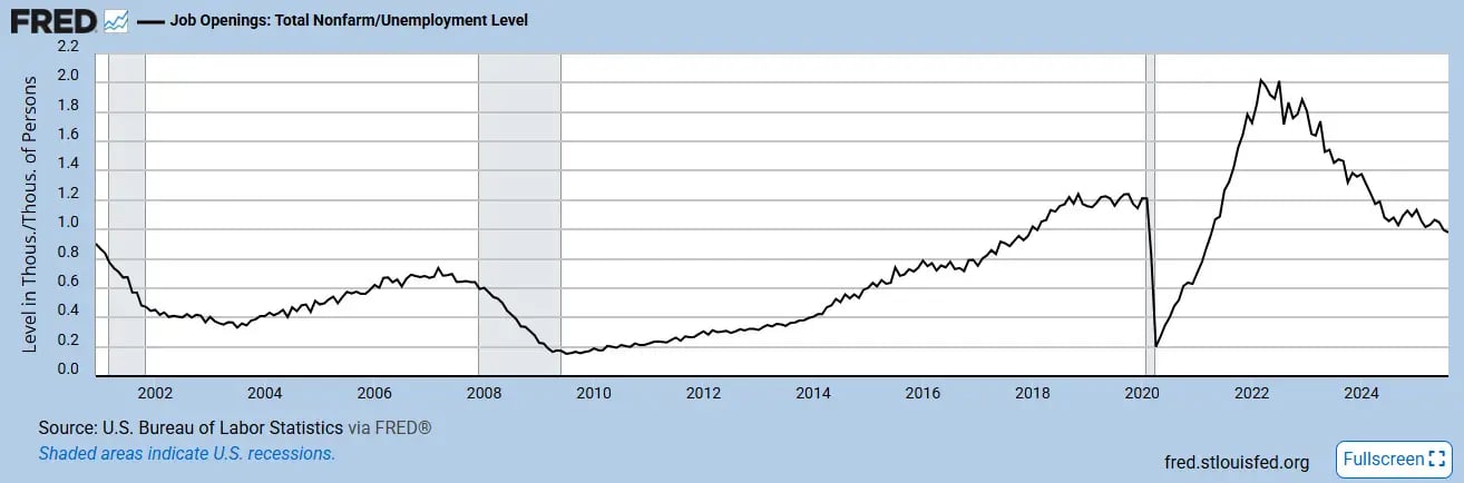 O número de vaga para cada desempregado caiu de 0,996 para 0,9787, o menor valor desde abril de 2021 (0,9584) e abaixo do nível pré-pandemia (1,2108 em fevereiro de 2020), refletindo o processo de desaquecimento do mercado de trabalho americano.