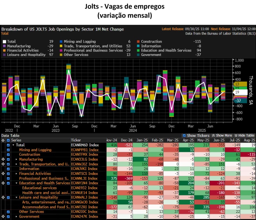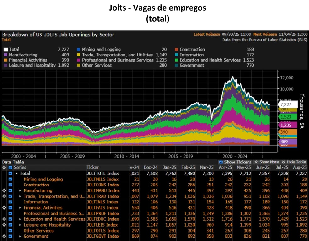 Os dados do Job Openings and Labor Turnover Survey (Jolts) mostraram que o número de vagas em aberto nos Estados Unidos subiu 19 mil em julho, para 7,227 milhões, resultado acima das expectativas de 7,200 milhões.