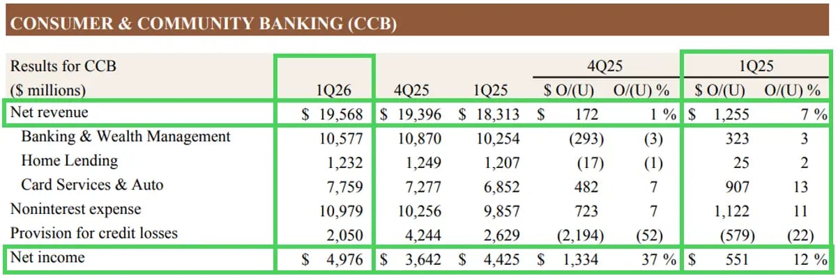 No segmento de Consumer & Community Banking (CCB), o crescimento foi mais moderado, mas ainda resiliente. A receita atingiu US$ 19,6 bilhões, alta de 7% na comparação anual, sustentada pela expansão da carteira de crédito e pela manutenção de níveis elevados de depósitos. O lucro do segmento atingiu US$ 5 bilhões, crescimento de +12% a/a.