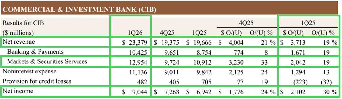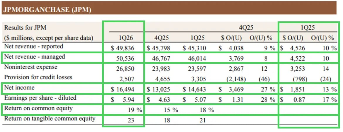 O JPMorgan Chase divulgou resultados do 1T26 acima das expectativas em praticamente todas as principais linhas, com destaque para as receitas de Markets e a recuperação relevante em Investment Banking.