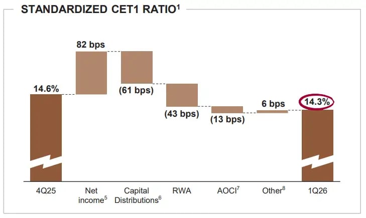 Esse nível de capitalização e liquidez oferece ampla flexibilidade para enfrentar diferentes cenários macroeconômicos, além de sustentar um nível elevado de retorno ao acionista. No trimestre, o banco distribuiu US$ 4,1 bilhões em dividendos e realizou US$ 8,1 bilhões em recompras de ações, reforçando a consistência de sua política de retorno de capital.