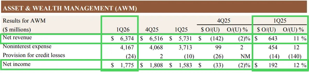 A divisão de Asset & Wealth Management (AWM) também apresentou desempenho consistente, com receita de US$ 6,4 bilhões, crescimento de 11% na comparação anual. O segmento segue se beneficiando de fluxos positivos e da valorização de mercado, com ativos sob gestão atingindo US$ 4,8 trilhões, alta de 16% no período, além de captação líquida de longo prazo de US$ 54 bilhões.