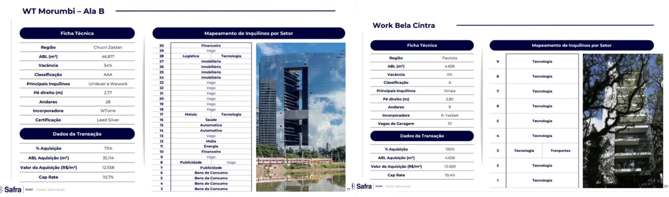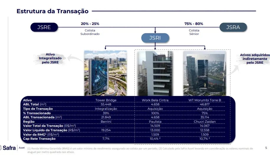 Destaco que o JSRI foi estruturado justamente para adquirir os imóveis WT Morumbi — Torre B e Work Bela Cintra, que antes faziam parte do portfólio do SARE11 e, mais recentemente, do BTLG11.