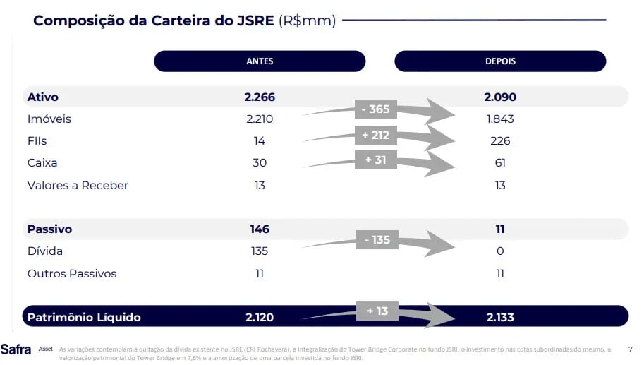 Além disso, o negócio permitiu a quitação de cerca de R$ 135 milhões em dívidas ligadas ao JSRE11, levando o patrimônio líquido do Fundo para algo próximo de R$ 2,13 bilhões após o ajuste.