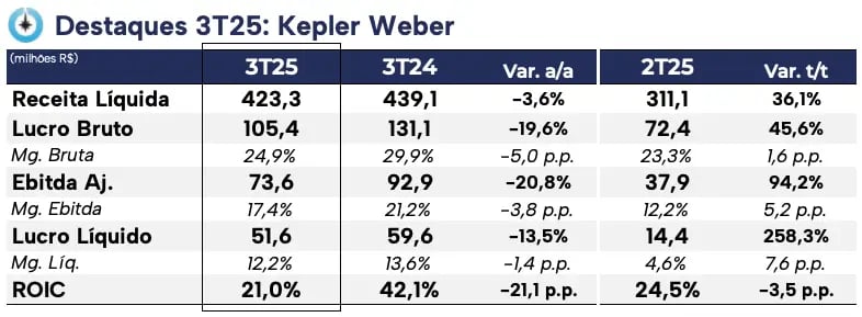 A Kepler Weber (KEPL3) reportou resultados um pouco melhores que a nossa expectativa no 3T25. Na comparação anual, a receita líquida totalizou R$ 423 milhões, uma queda de -3,6%, um Ebitda de R$ 73,6 milhões, recuo de -20,8%, e um lucro líquido de R$ 51,6 milhões, -13,5% menor que no mesmo trimestre de 2024 (3T24).