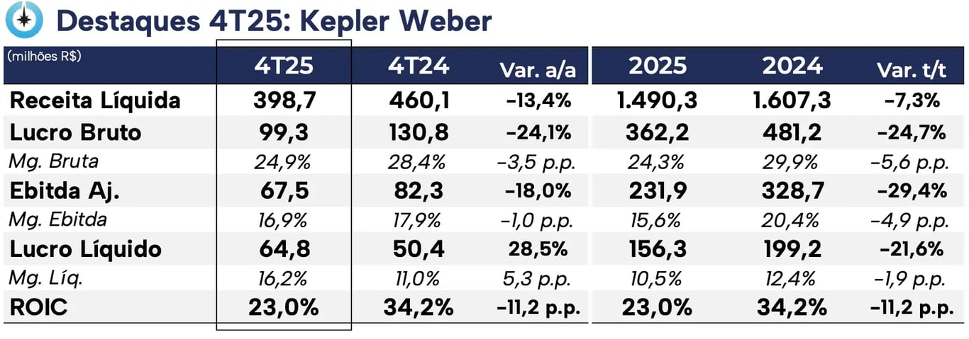 A Kepler Weber (KEPL3) reportou resultados ligeiramente acima da nossa expectativa para o 4T25. Na comparação anual, a receita líquida totalizou R$ 398,7 milhões, uma queda de -13,3%, um Ebitda de R$ 67,5 milhões, recuo de -17,7%, e um lucro líquido de R$ 64,8 milhões, crescimento de +28,5% comparado ao mesmo trimestre de 2024 (4T24).