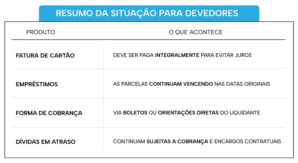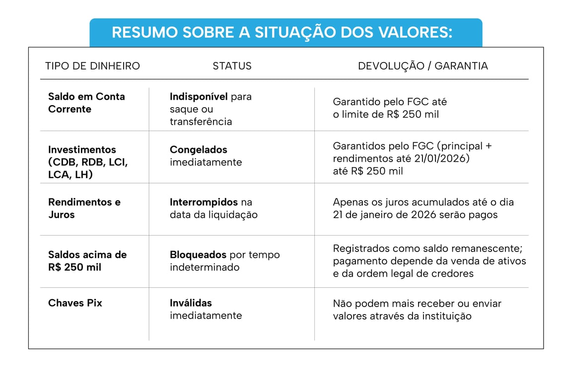 O saldo em conta passa a integrar o passivo da instituição, e os clientes se tornam credores, sujeitos aos prazos e procedimentos do Fundo Garantidor de Créditos (FGC), respeitando o limite de R$ 250 mil por CPF.