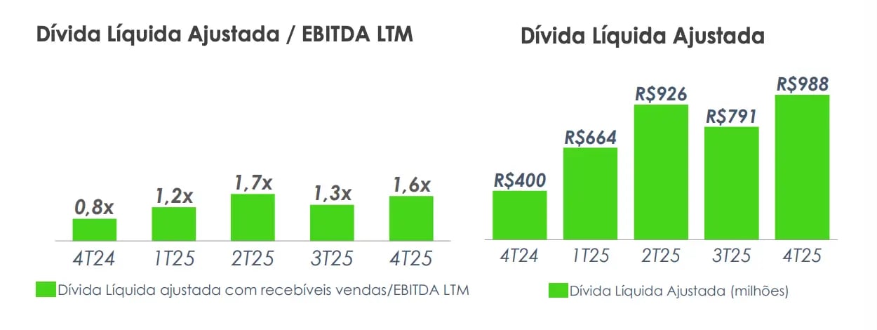 Considerando recebíveis das vendas de ativos, de R$ 780 milhões, a dívida líquida ajustada ficou em R$ 988 milhões e a alavancagem (dívida líquida/Ebitda) em 1,6x (+0,8 p.p.).