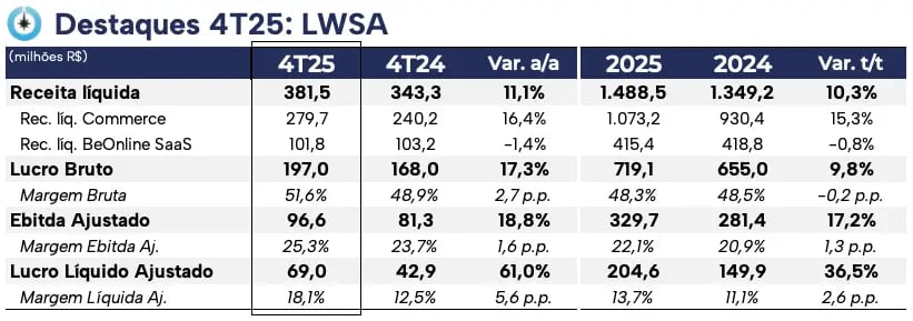 A LWSA (LWSA3) vale a pena após os resultados do 4T25? A companhia reportou números acima das expectativas, com crescimento relevante de receita, Ebitda e lucro líquido.
