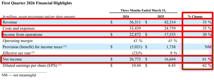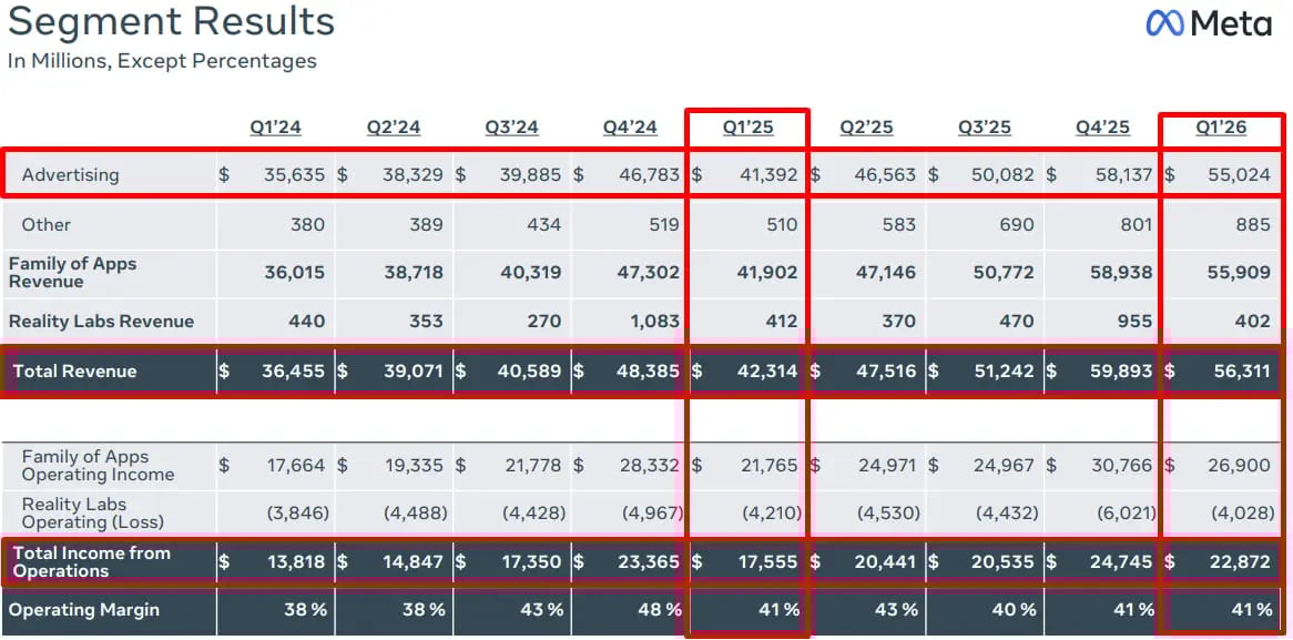 A Meta divulgou seus resultados do 1T26 com números muito fortes, acima das expectativas em praticamente todas as linhas relevantes. A receita atingiu US$ 56,3 bilhões, crescimento de 33% na comparação anual, acima do consenso. O lucro por ação ficou em US$ 10,44, bem acima dos US$ 6,67 esperados. O lucro líquido cresceu 61% no período.