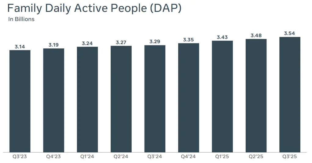 Quando olhamos para as métricas dos negócios, a Meta atingiu 3,54 bilhões de usuários diários de seus aplicativos. Um crescimento de +8% na comparação anual. Apenas o Instagram, chegou a marca de 3 bilhões de usuários mensais. Excluindo China, isso é quase metade do planeta terra em alcance.