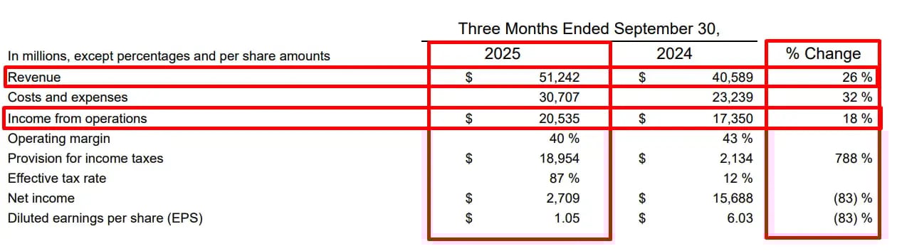 Começando pelo final. Por que nós gostamos dos resultados neste trimestre, mas não no último? No último trimestre comentamos da expectativa que tínhamos do aumento de custos com a depreciação dos GPUs em Data Centers. Bem, chegou. A margem operacional (EBIT) caiu de 43% no ano passado, para 40% neste.