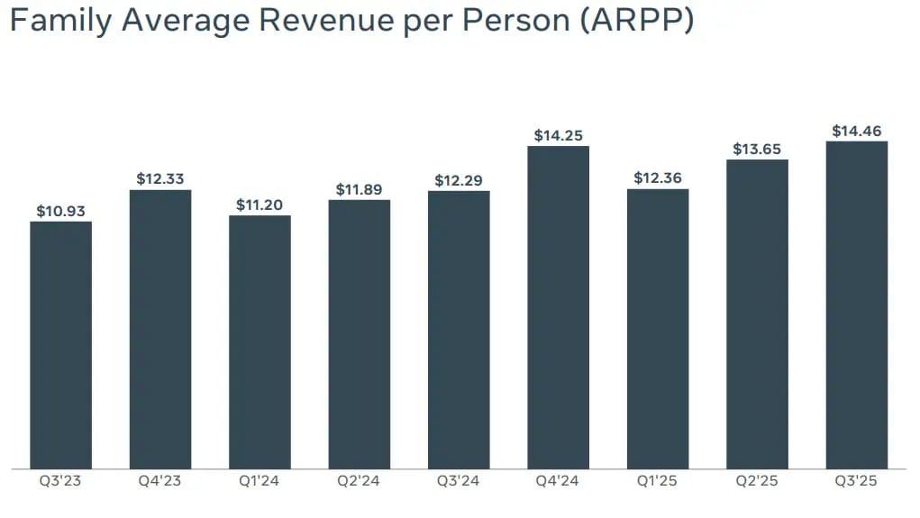 Além do crescimento de usuários, a receita por usuário segue crescendo de forma impressionante. A receita média por usuário no trimestre foi de US$ 14,5. Crescimento de +17,7% na comparação com o ano passado. Isso se dá em função da empresa estar, de forma bem-sucedida, integrando AI aos seus negócios. Melhorando a entrega de ads e conseguindo reter a atenção dos usuários dentro de seus apps.
