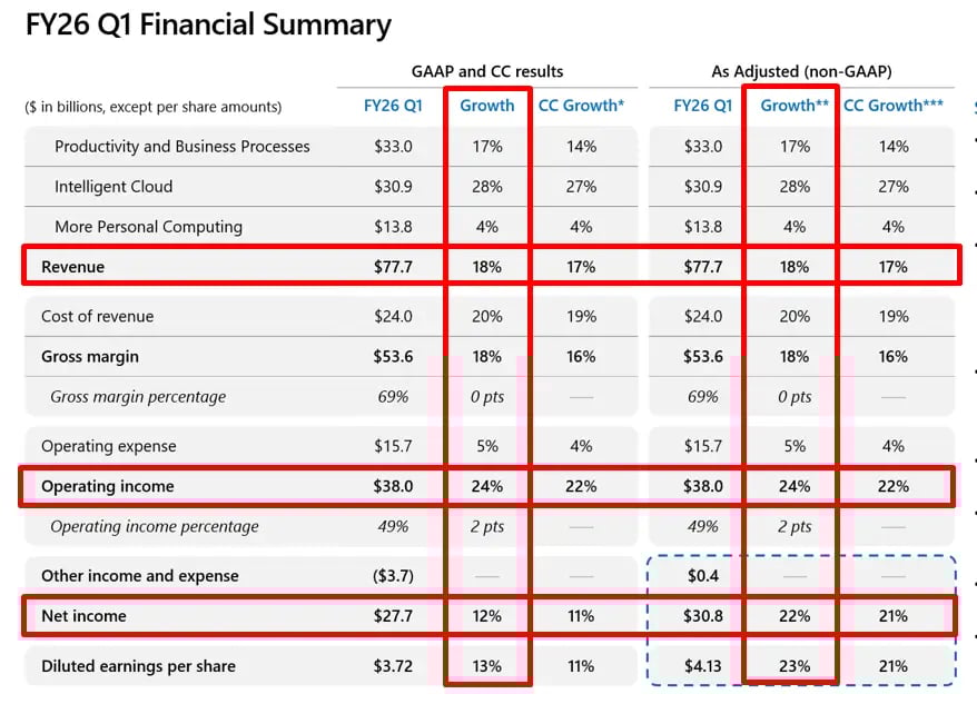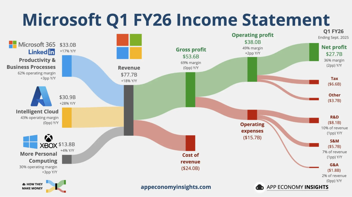 Dentro da Intelligent Cloud, o Azure — principal linha de crescimento ligada a AI — teve um crescimento de +40% na comparação com o mesmo período do ano anterior.