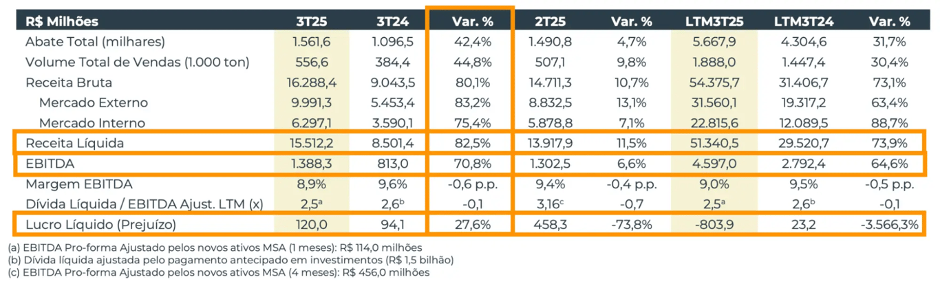 A receita líquida da Minerva (BEEF3) atingiu R$ 15,5 bilhões no 3T25, aumento de +82,5% na comparação anual, enquanto o Ebitda cresceu +71%, alcançando R$ 1,4 bilhão, com margem de 8,9% (-0,6 p.p.). Já o lucro líquido totalizou R$ 120 milhões no trimestre, um crescimento de +28% em relação ao mesmo período do ano passado.
